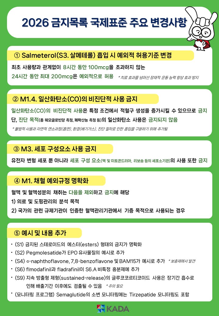 ¼¼°èµµÇιæÁö±â±¸(WADA)ÀÇ 2026³âµµ ±ÝÁö¸ñ·Ï ±¹Á¦Ç¥ÁØ °³Á¤ ½ÃÇà¿¡ µû¶ó, ÁÖ¿ä º¯°æ»çÇ×À» ¾È³»µå¸®¿À´Ï ¼Ò¼Ó ¼±¼ö ¹× ÁöµµÀÚ°¡ °ü·Ã ³»¿ëÀ» ¼÷ÁöÇÒ ¼ö ÀÖµµ·Ï Àû±Ø ÇùÁ¶ÇÏ¿© Áֽñ⠹ٶø´Ï´Ù.